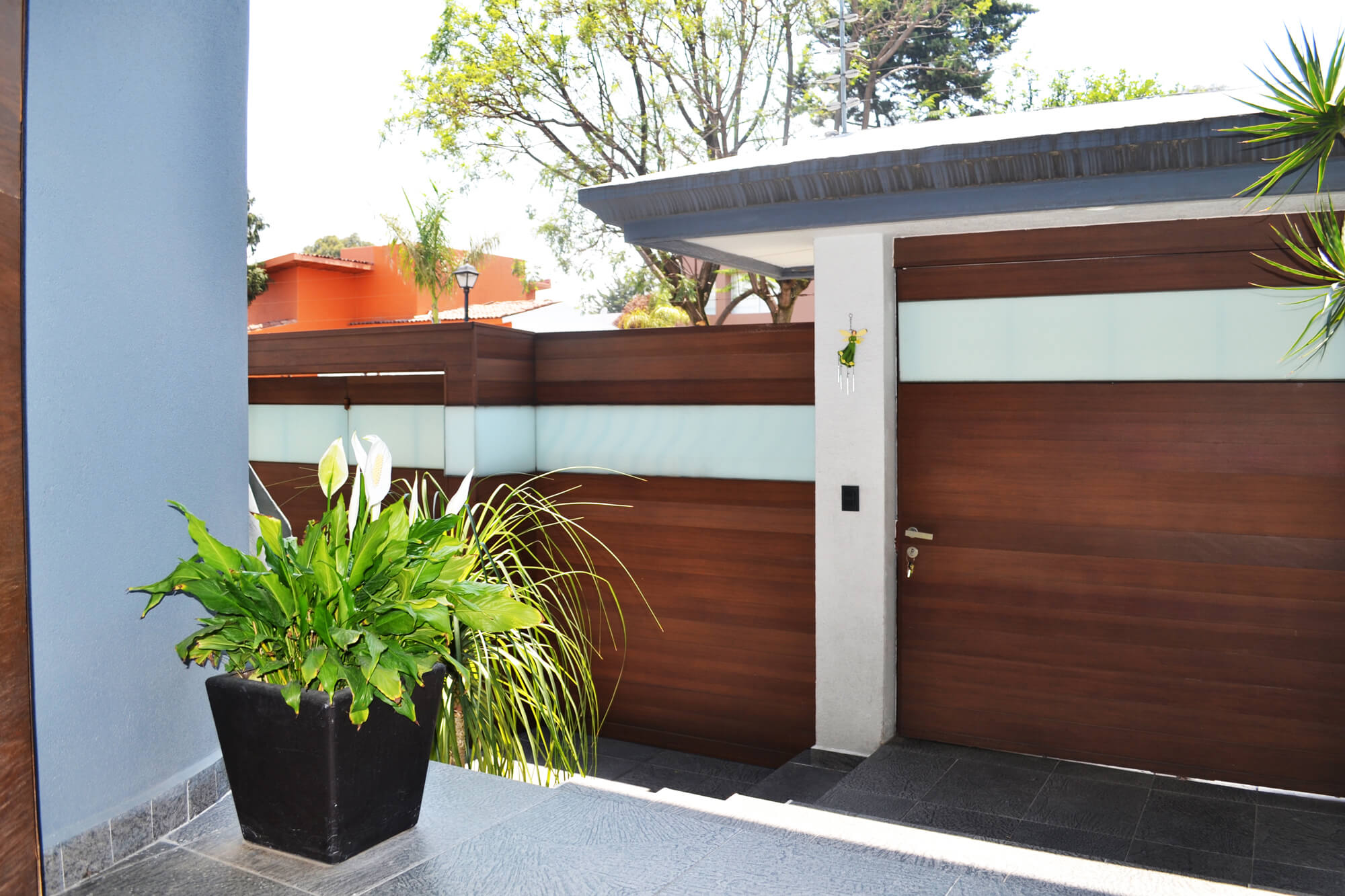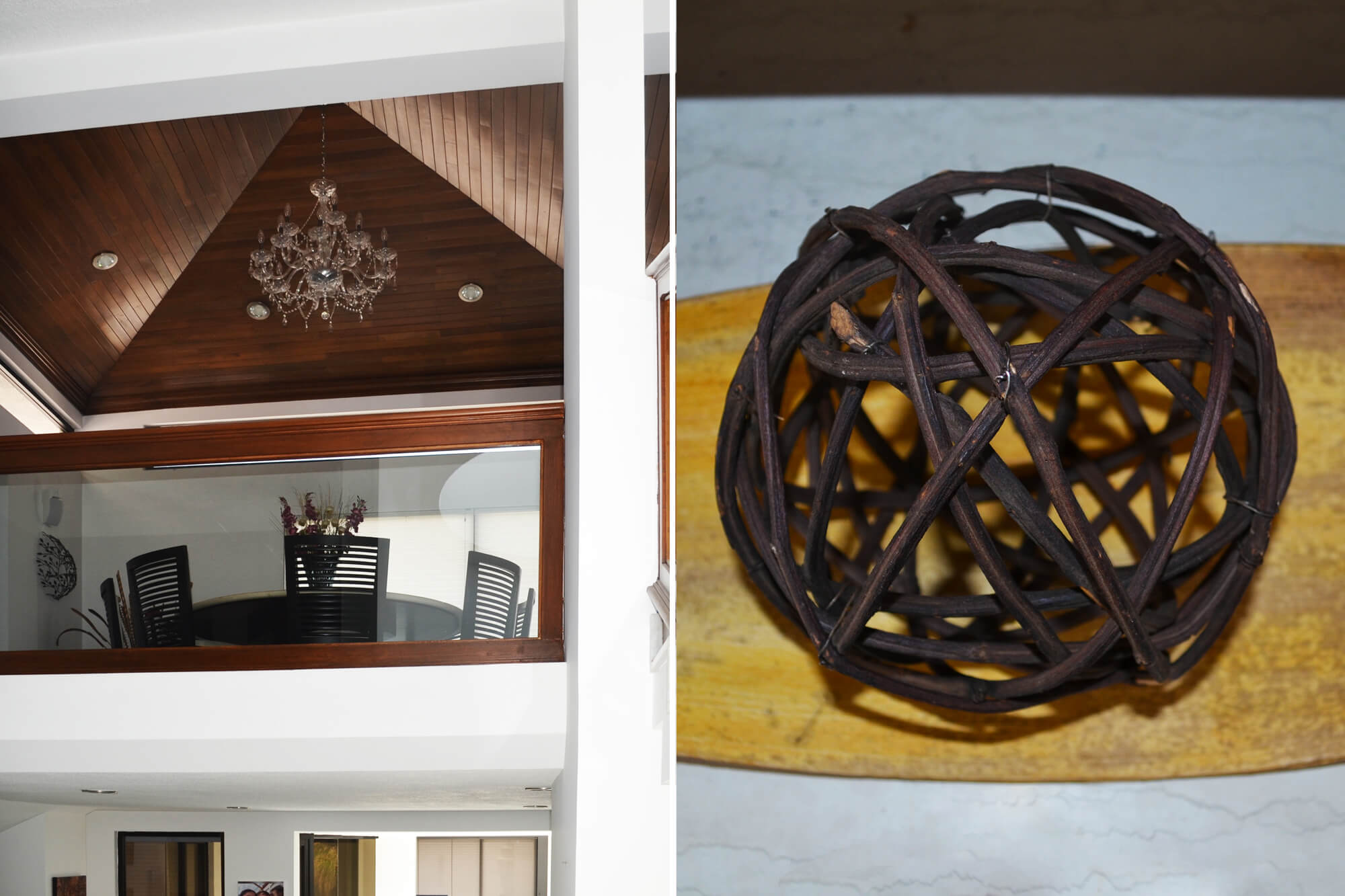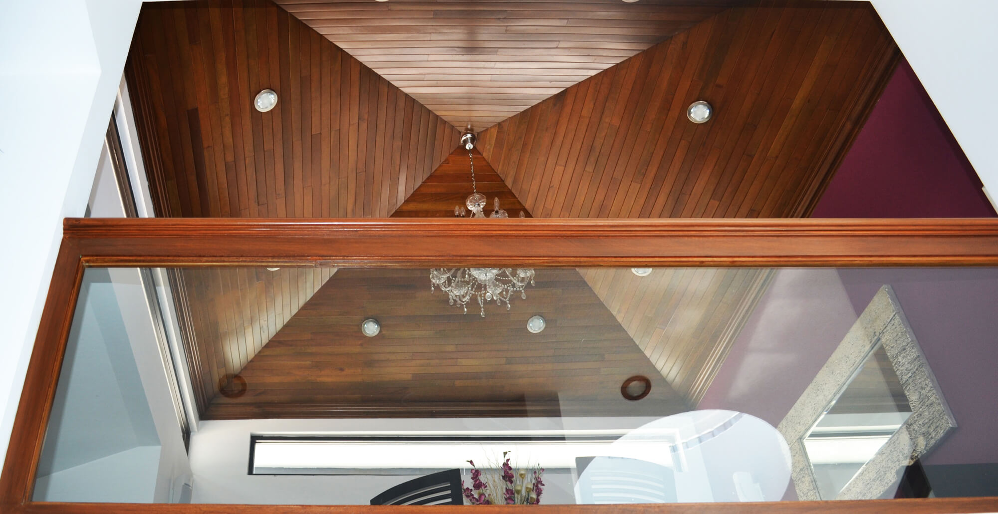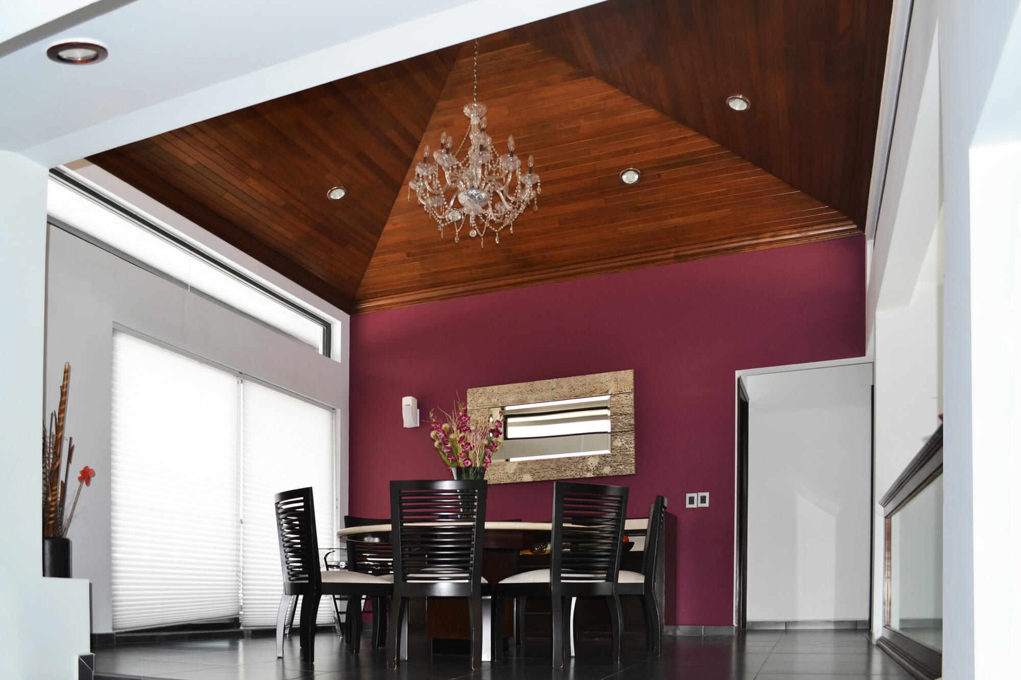 Los acabados dominantes son de madera, tablones en piso en áreas de recámaras y sala familiar, plafón de madera en comedor y en muro principal del área de estar principal. Se diseñaron muebles para libreros con nicho para empotrar pantallas de tv panorámicas.