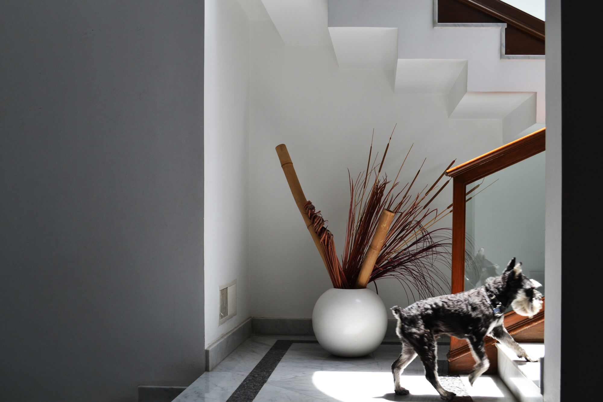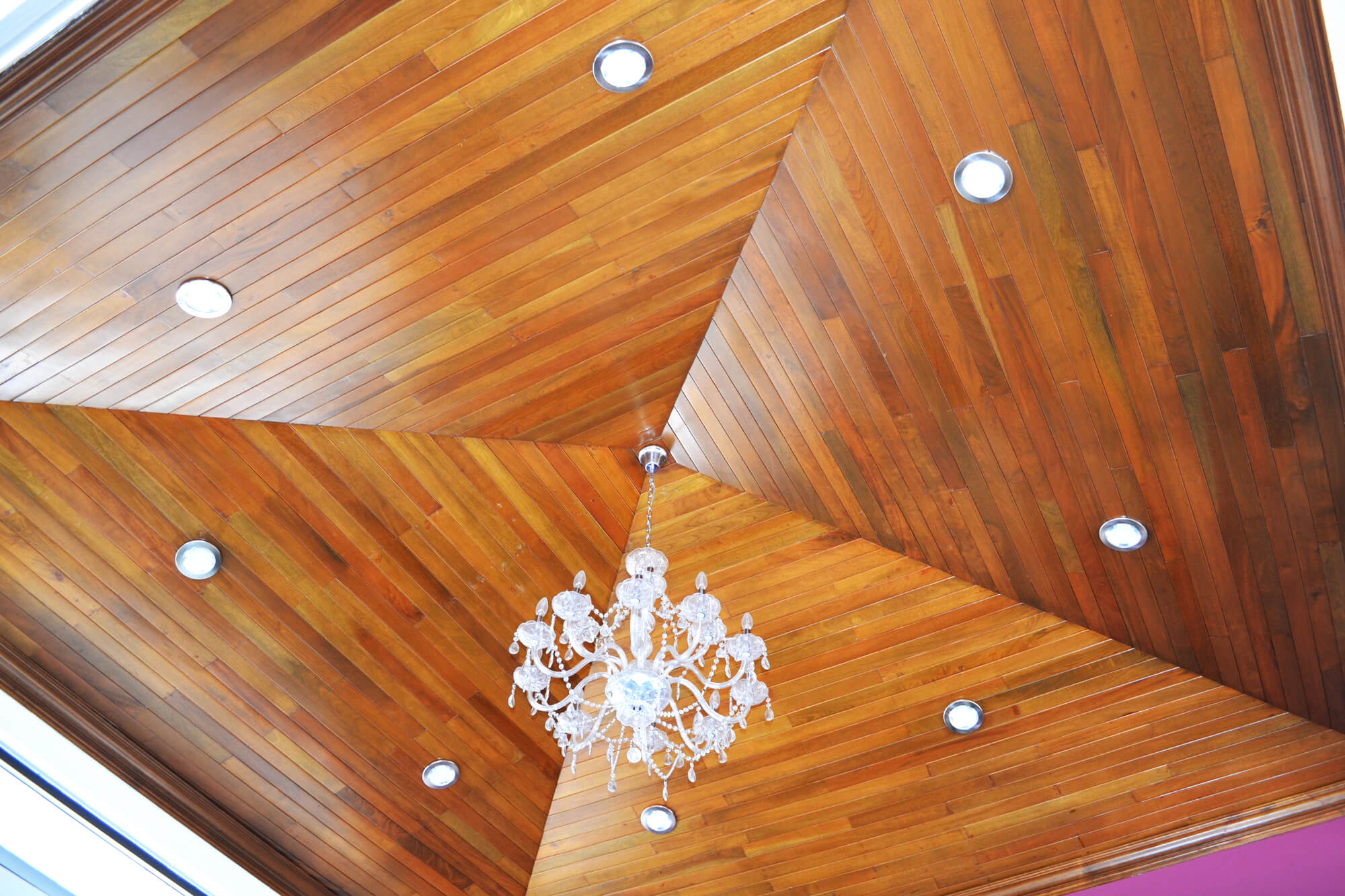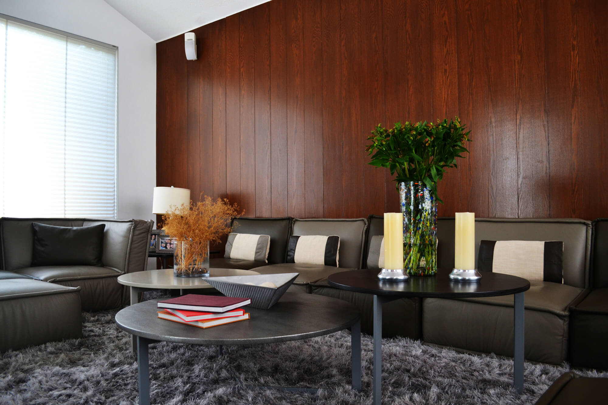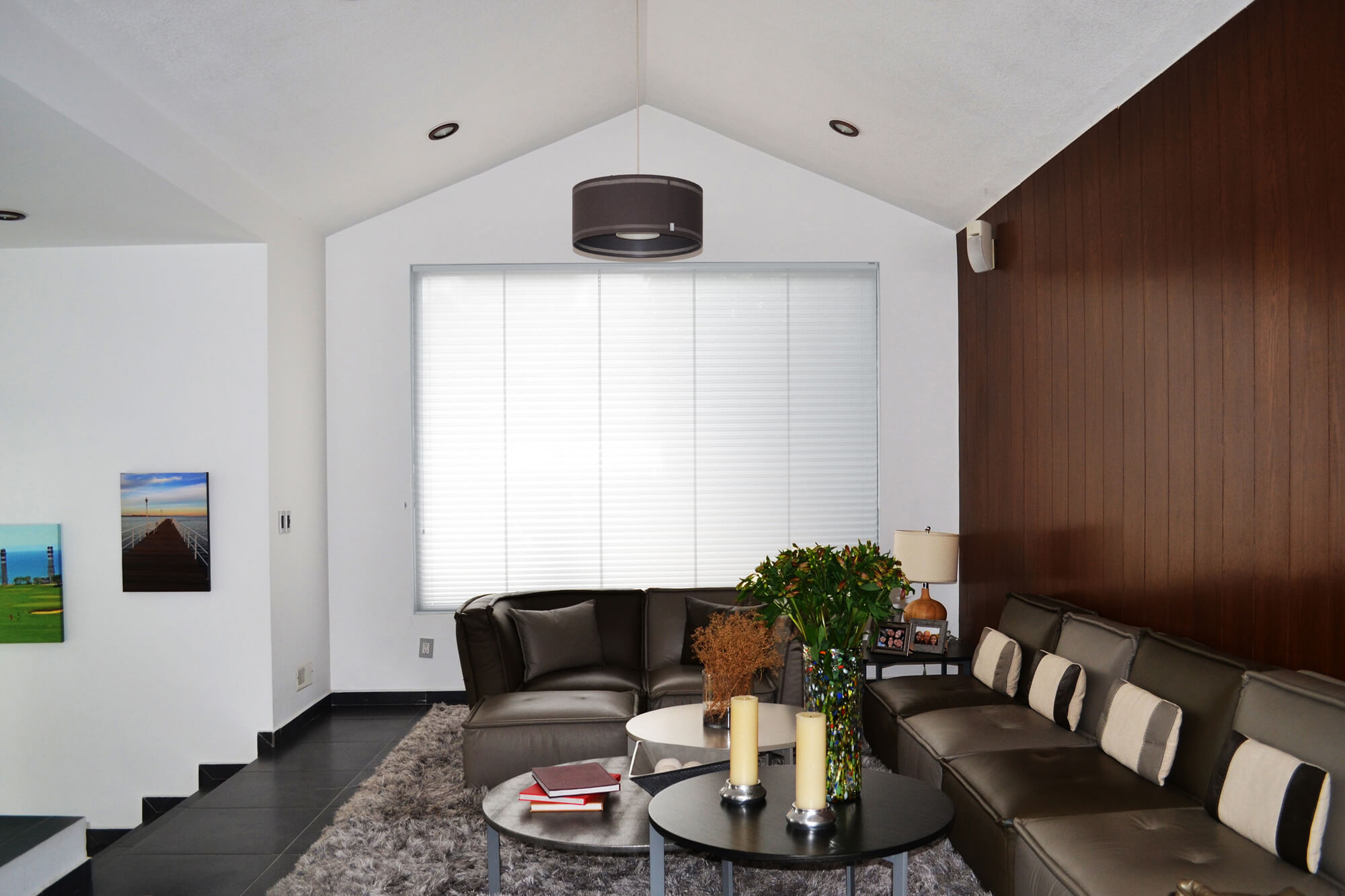 Los acabados dominantes son de madera, tablones en piso en áreas de recámaras y sala familiar, plafón de madera en comedor y en muro principal del área de estar principal. Se diseñaron muebles para libreros con nicho para empotrar pantallas de tv panorámicas.