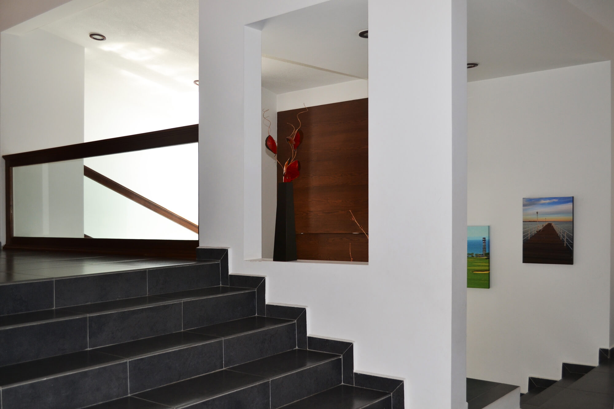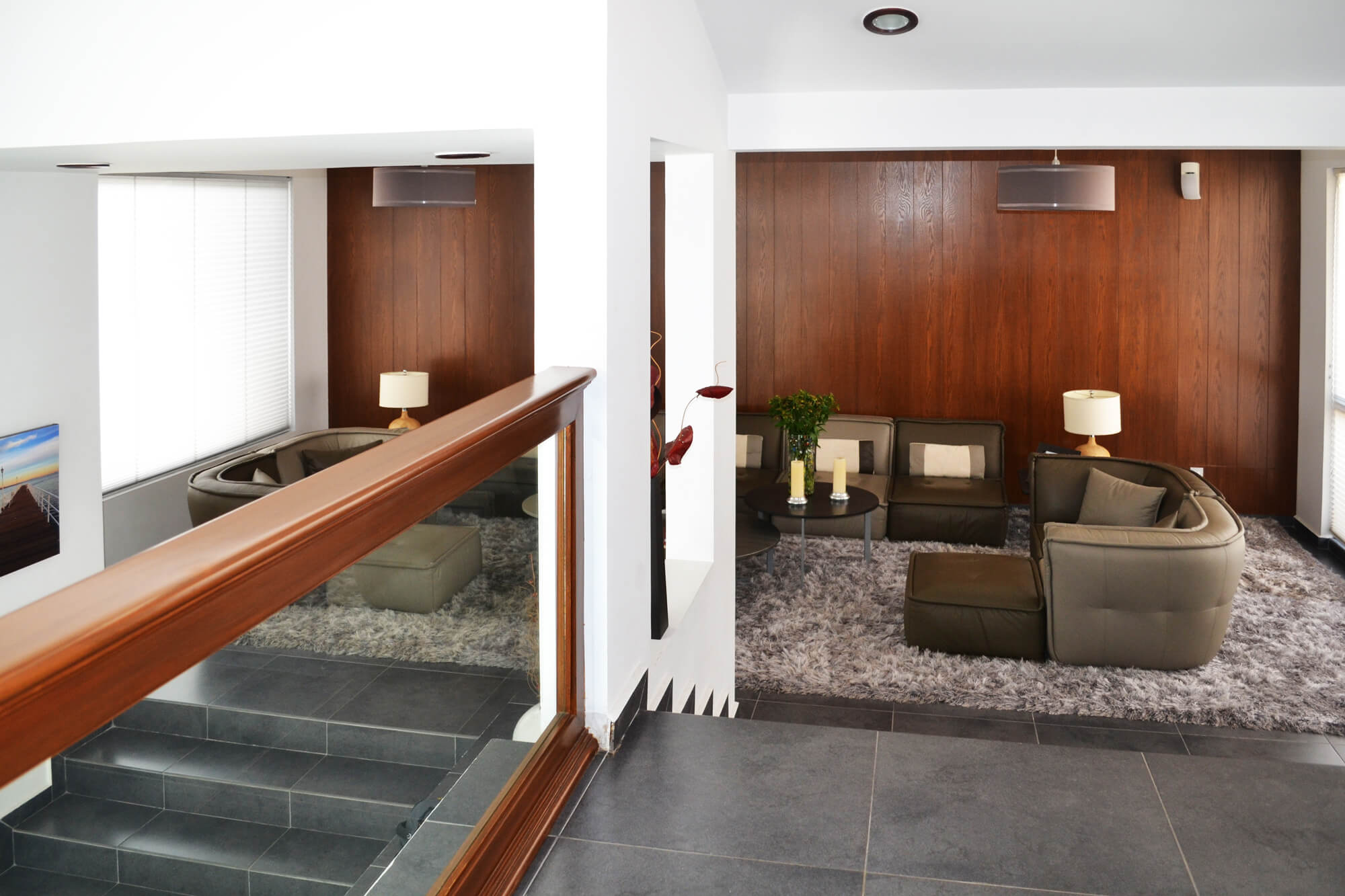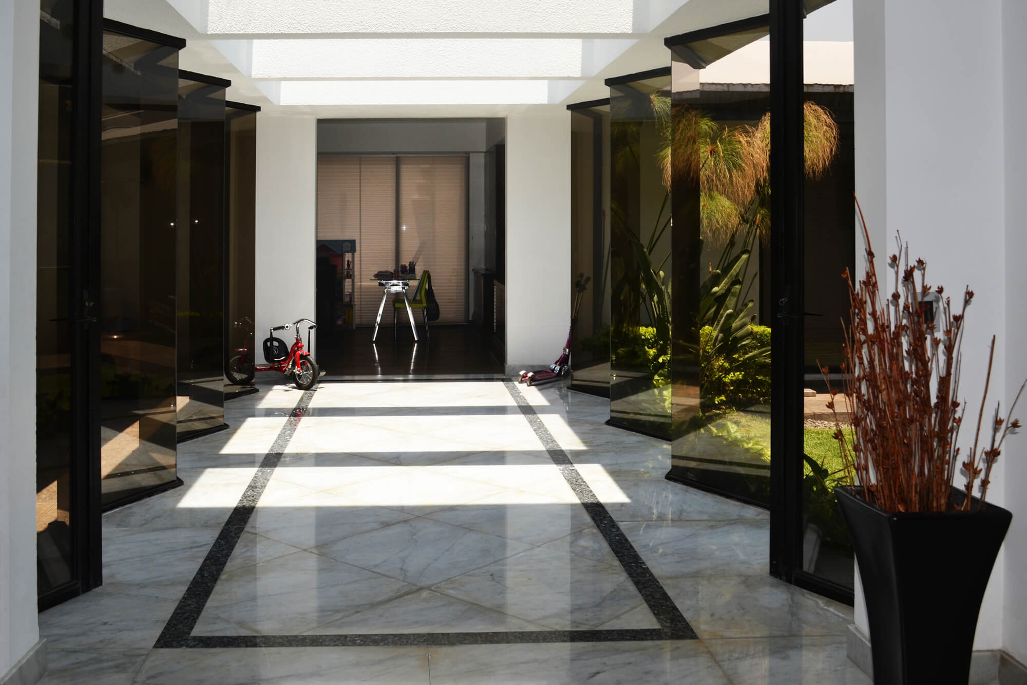 Se ordena el área de la sala familiar de manera funcional, adaptando y complementando el amueblado fijo integrándolo al acceso de la recámara principal, de tal manera, que este se pierda en el conjunto. Se re-diseñaron los baños, haciéndolos más funcionales y modernos utilizando canceles de cristal templado combinados con mesetas de mármol dando forma a áreas para tocador.